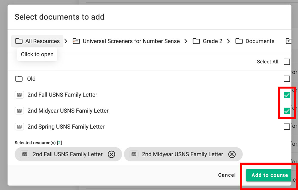 Step 5: Select the document/Handouts(s) to add with the green checkbox. Click “Add to Course.”