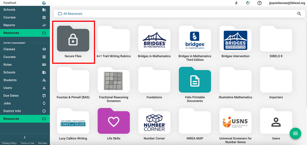 This article explains how users with district write access (read about roles here) can upload or download files securely through Forefront resources.