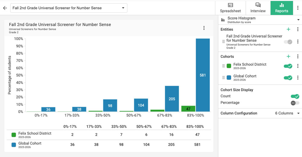 Forefront’s de-identified, aggregated data sets allow you to compare results for your students to a national data set. As of February 2024, the Universal Screeners for Number Sense (USNS) cohort comprised 125 school districts, 545 schools, and 100,750 student records. Note that when assessments are cloned and modified, it is no longer possible to compare those assessment results to the national data set.