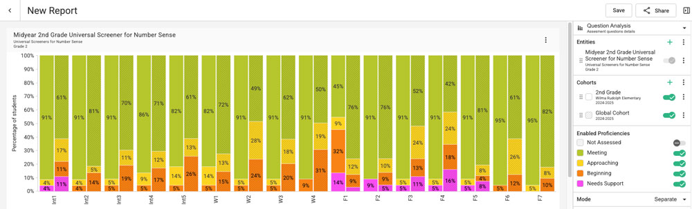 - How valid is our data collection — are we comparing data for the same number of students? Are we seeing positive trends in our fidelity to collecting and entering data? (“Not Assessed” has been toggled on in the proficiencies on the right to see if there are students who should have data with no data — in this example, things look good.)