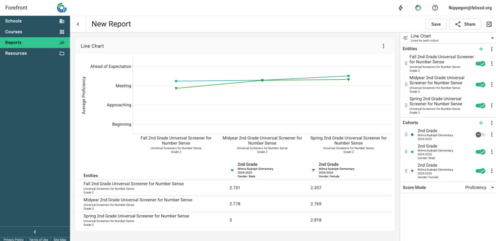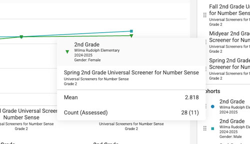 Use the Line Chart to track progress over time. Entities to consider focusing in: all the assessments within a unit, pre-tests to post-tests, interim or benchmark assessments, or progress monitoring assessments. Learn more about how to configure reports going across school years here.