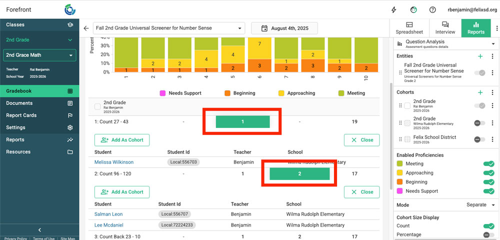 Toggle on larger cohorts (groups of students) to get more context on the difficulty of questions.