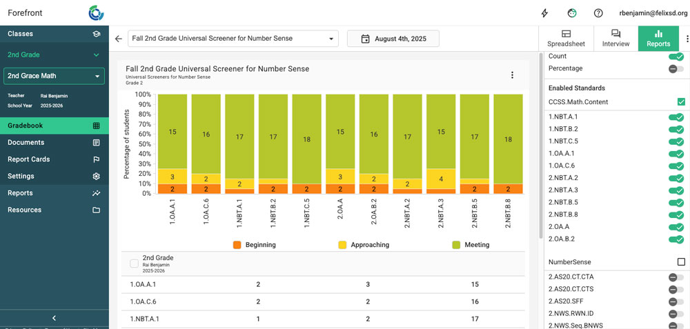 This report shows performance on standards assessed for your class (or additional cohorts). If there are more than one set of standards, note that systems or individuals can be toggled off in the right sidebar.