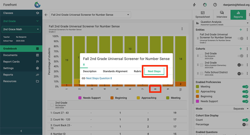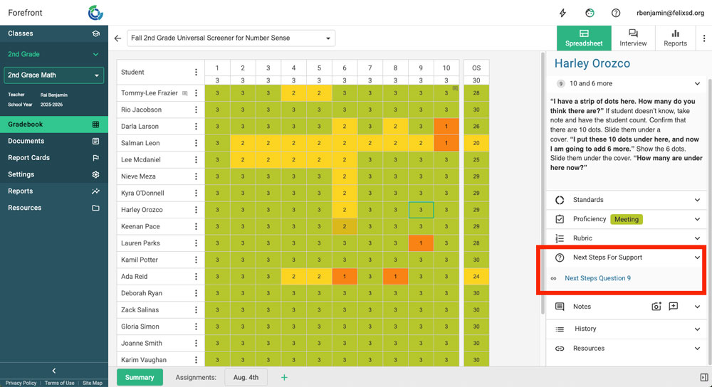 Next Steps materials are instructional resources aligned to the skills on an assessment. They are available for the USNS, FRS, Bridges Third Edition, DIBELs, and may have been configured by your district on a custom district assessment.