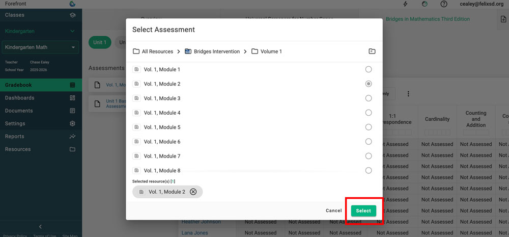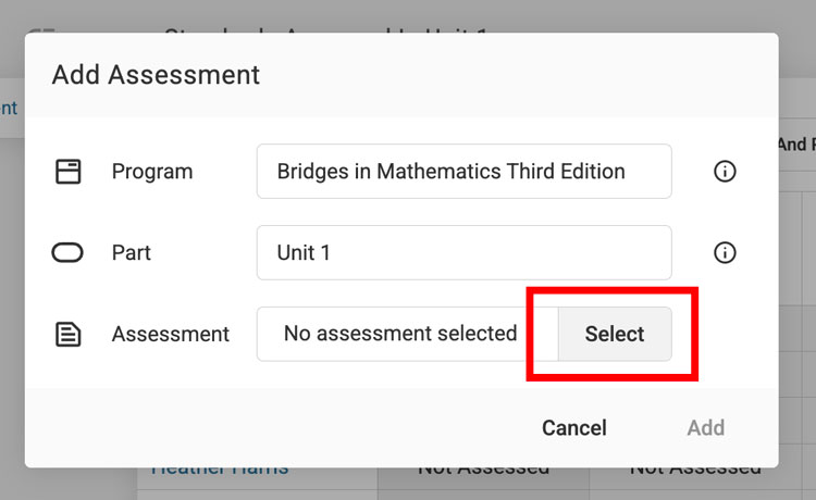 Step 4: Navigate to the desired assessment. Click "Select" then "Add" in the other modal to add the assessment.