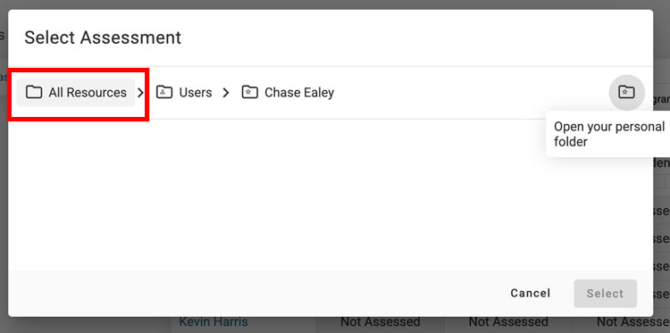Step 3: Use the breadcrumb trail to navigate out to "Resources" if the assessment is not in your user folder -- the default starting location.