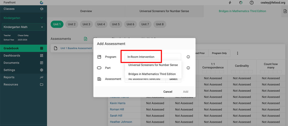Program: The larger bucket for grouping assessments, visualized to the teacher as the tabs across the top of the class view. Examples are Bridges Third Edition, Universal Screeners for Number Sense, or DIBELs.
