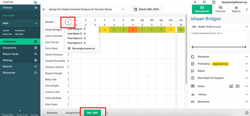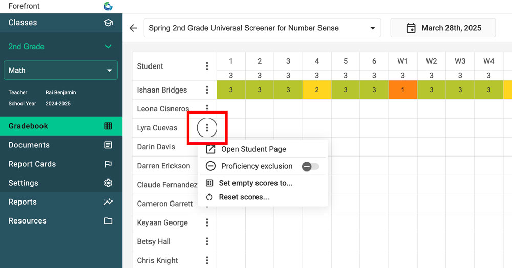 To set scores to max, min, or other value by student, or reset the row data, click the three-dot menu to the right of the student name. Note: If the option is greyed out, make sure you are clicked into the correct date tab at the bottom.