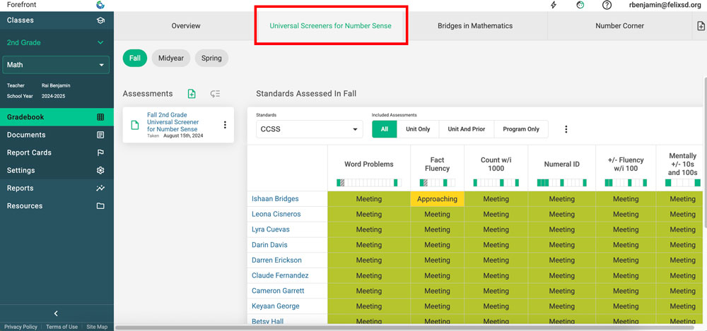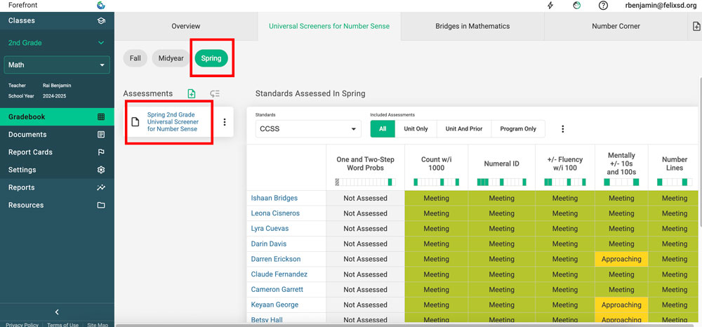 Programs may have Next Steps — instructional activities and recommendations based on the assessed skills. (DIBELs, Bridges Third Edition, the Universal Screeners for Number Sense and the Fractional Reasoning Screeners have these preconfigured and they can also be configured for district custom assessments.) In the spreadsheet, access any available Next Steps by clicking in the right sidebar.