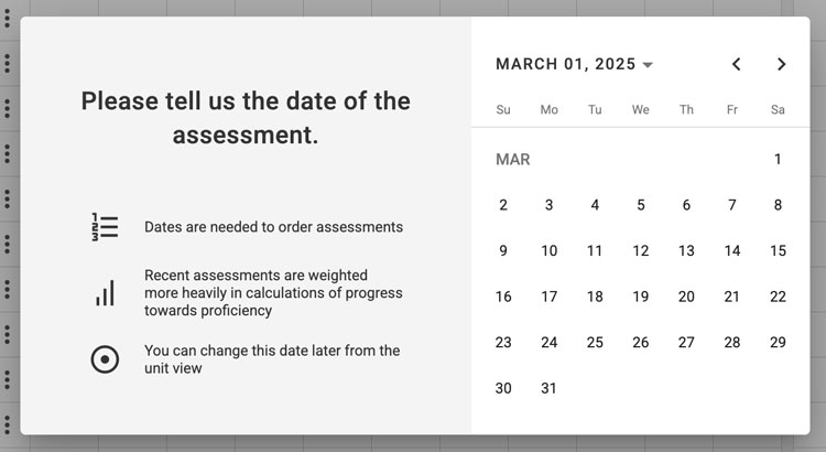 After entering a score, you will be prompted to select the date the assessment was given. This is important to enter correctly, as it dictates the proficiency calculation. It can be changed later.