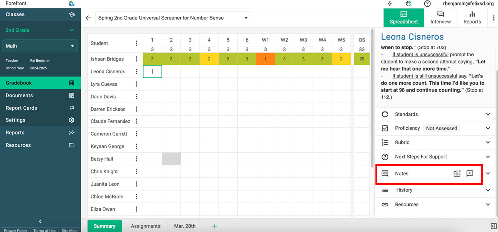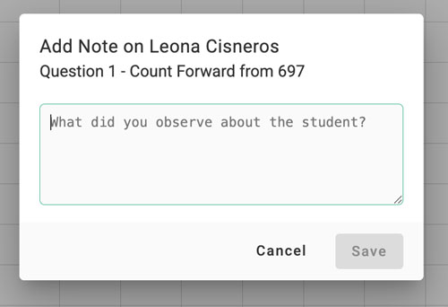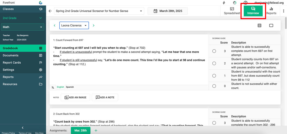 For assessments given as interviews, the interview tool is helpful for assessment administration and scoring. For interview assessments, clicking “Interview” opens a view where the script of the assessment and the rubric are accessible in one place. You can select the correct score from here, and it will feed into the spreadsheet. As you assess, add notes by clicking the note button below.