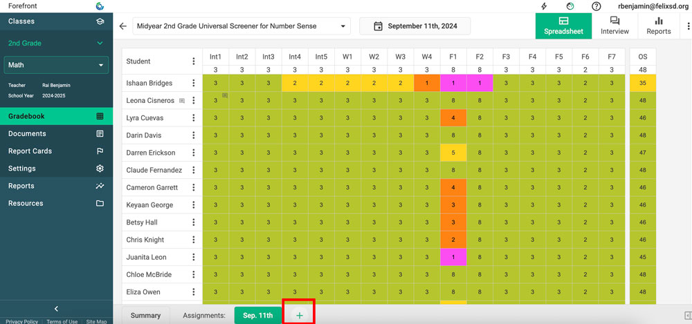 Forefront users can enter reassessment data in a single click. On the bottom of the spreadsheet, click the green plus and select the date of the reassessment. Reassessments for can be all or some students and for all of the assessment or certain questions.