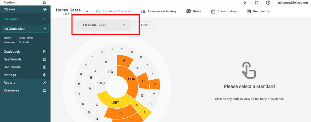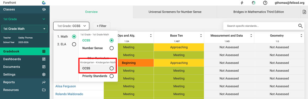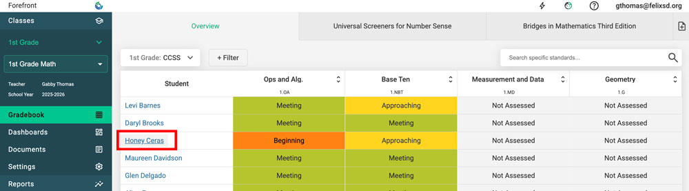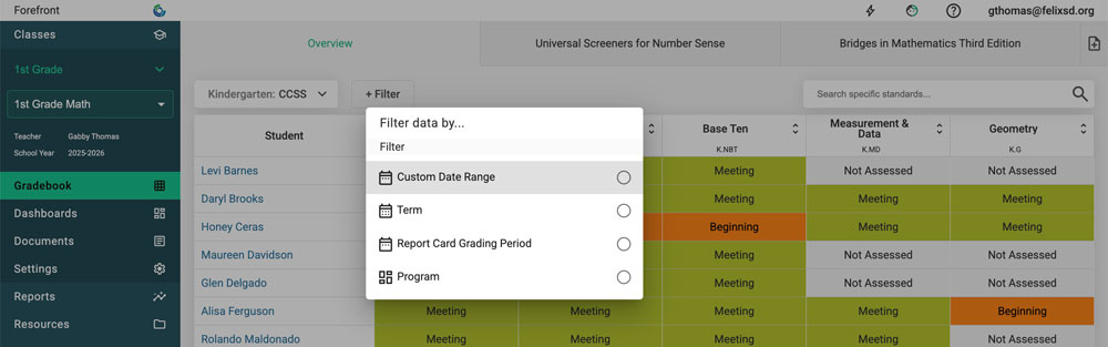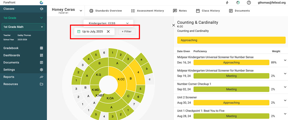 When students have data from previous years, it can be viewed in the Overview Page and Student Proficiency. It can be a great help to teachers in the new school year to "pop back" to their students' previous data. For example, a second-grade teacher whose students had data entered in Forefront the past two years, could drop back on the overview page to see their first grade and kindergarten data.