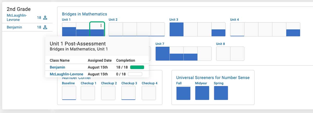 The pacing page is for leaders to help support teachers inputting data. Each square represents an assessment. The amount of blue filling the square represents the percent of students with a completed assessment (note that if a teacher skipped a question, it would generally not show up as "done" on the pacing page). Hover to see which teachers have entered what data. Learn more about the pacing page here.