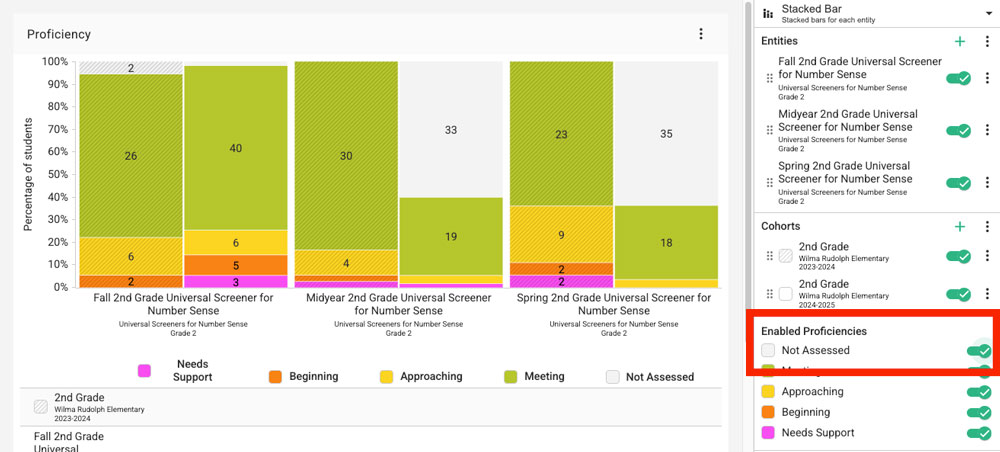 In any report, toggling on "not assessed" will visualize the number of "missing" data points. The number of not assessed represents the number of students in classes enrolled in the course (in this example, the number of second grade students in second grade) that do not have data. In this report, the overall is being shown, so students will need to have all questions completed and entered to show up. In a Question Analysis Report or a report looking at standards, "partial" assessment data will show up.