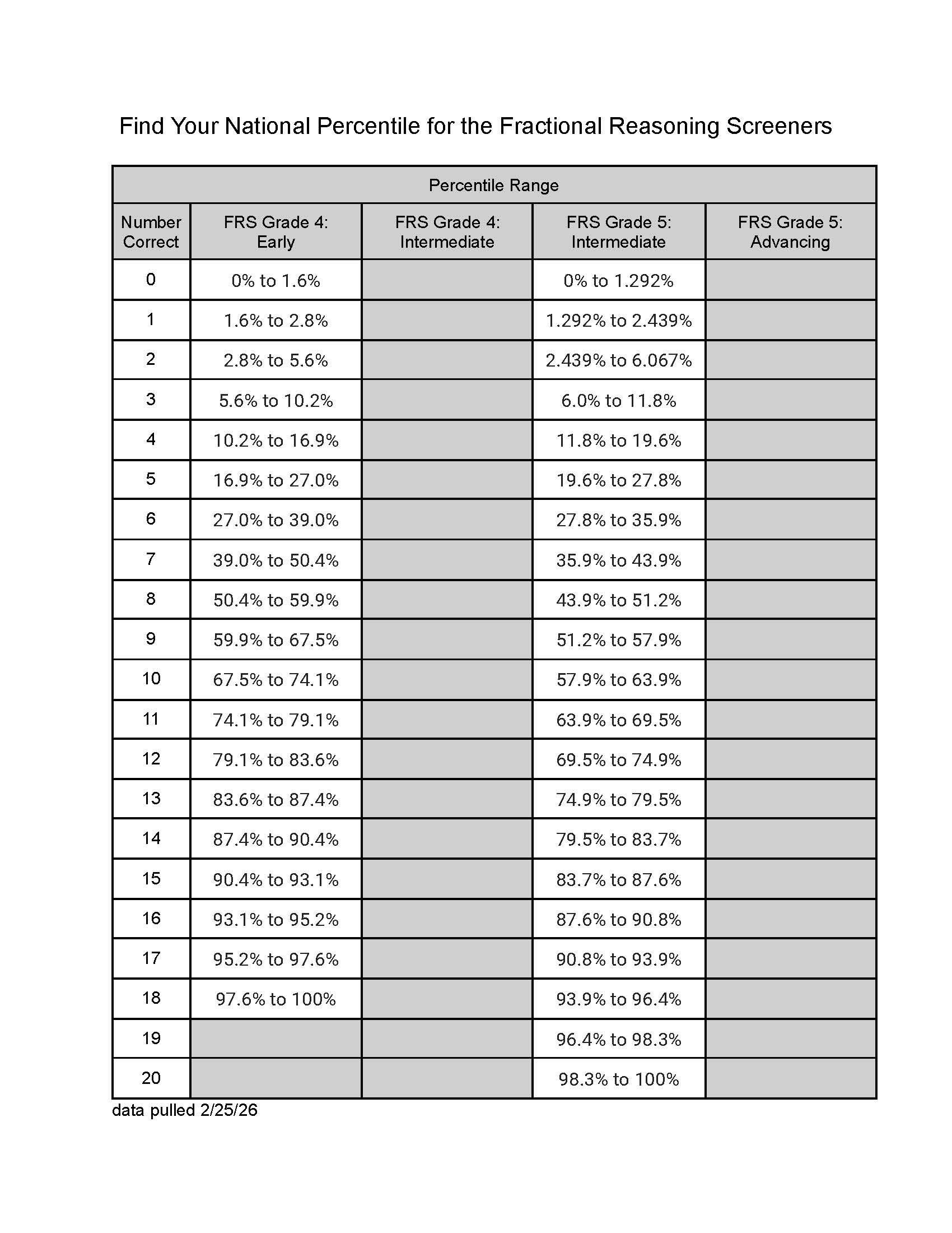 The FRS Next Steps are resources to aid instruction on the skills of the Fractional Reasoning Screener.